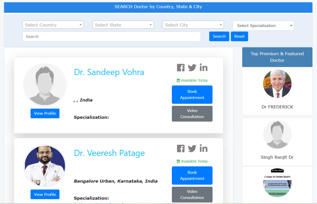 | Dr. S. Mehta | Orthopedics | Mumbai, IND | 20 years | Global Spine & Ortho | Joint & Spine Surgery |