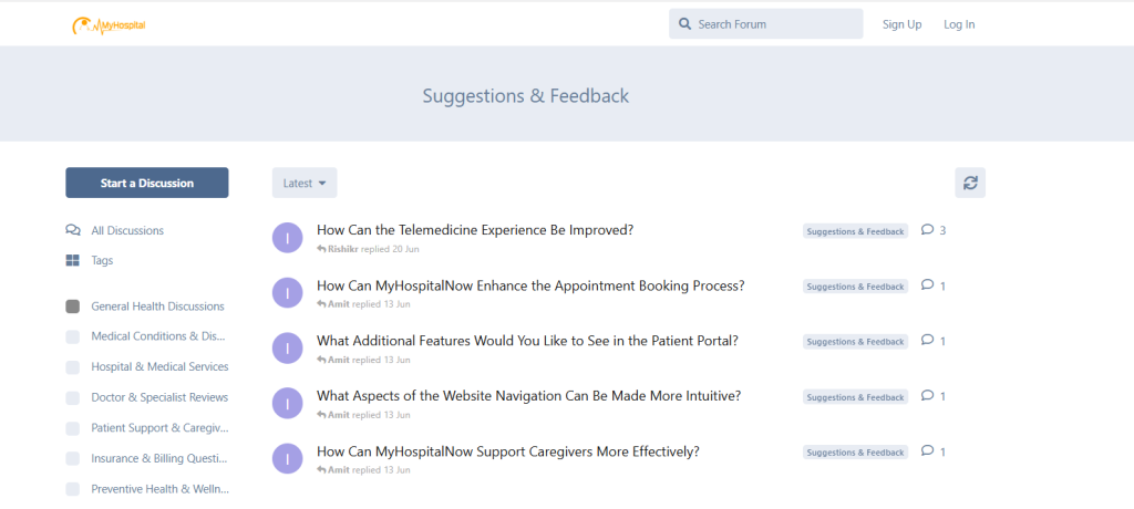 The Suggestions & Feedback forum on MyHospitalNow is a space where users can: