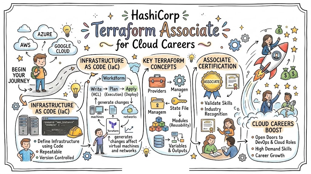 HashiCorp Certified Terraform Associate is a foundational certification focused on Terraform concepts, workflow, and real-world infrastructure-as-code usage. It validates that you understand how Terraform can define and manage infrastructure safely and consistently across environments.